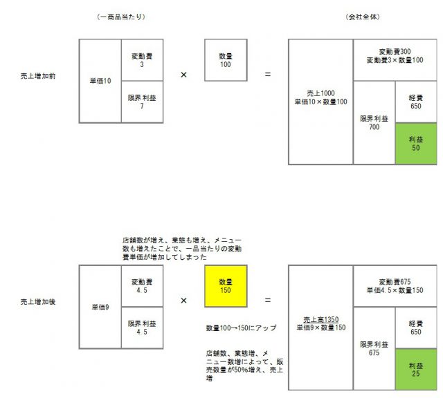 ②しかし、販売数量と比例する仕入において、店舗数が増え、メニューが増えたことで、以前よりも一品当たりの変動費単価が増加してしまった。