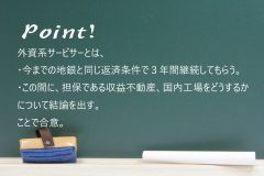 そうして、サービサーとの合意の3年目を迎え、収益不動産、国内工場を売却し、弁済。