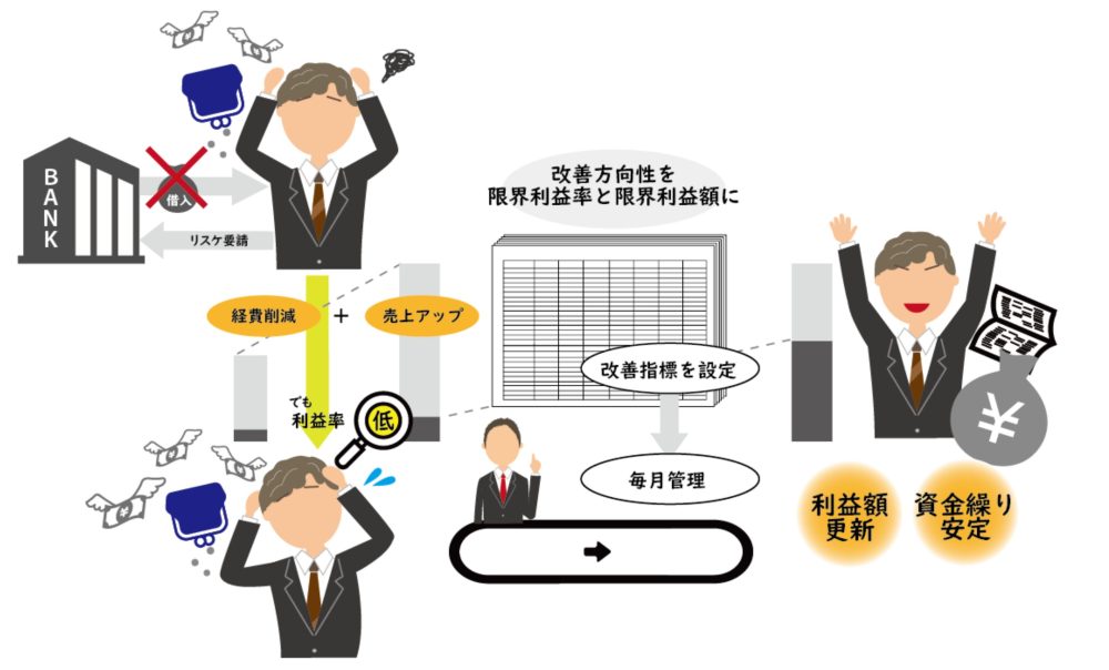 得意先別、製品別貢献利益の把握ができないという事情から、改善の方向性を限界利益率と限界利益額のアップとし、改善指標を設定。