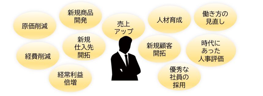 企業や経営者が抱える問題や悩みは、いくつもの原因が絡み合っており、その問題の領域も、資金面だけでなく、売上や組織、人事、販売、戦略、管理など様々です。