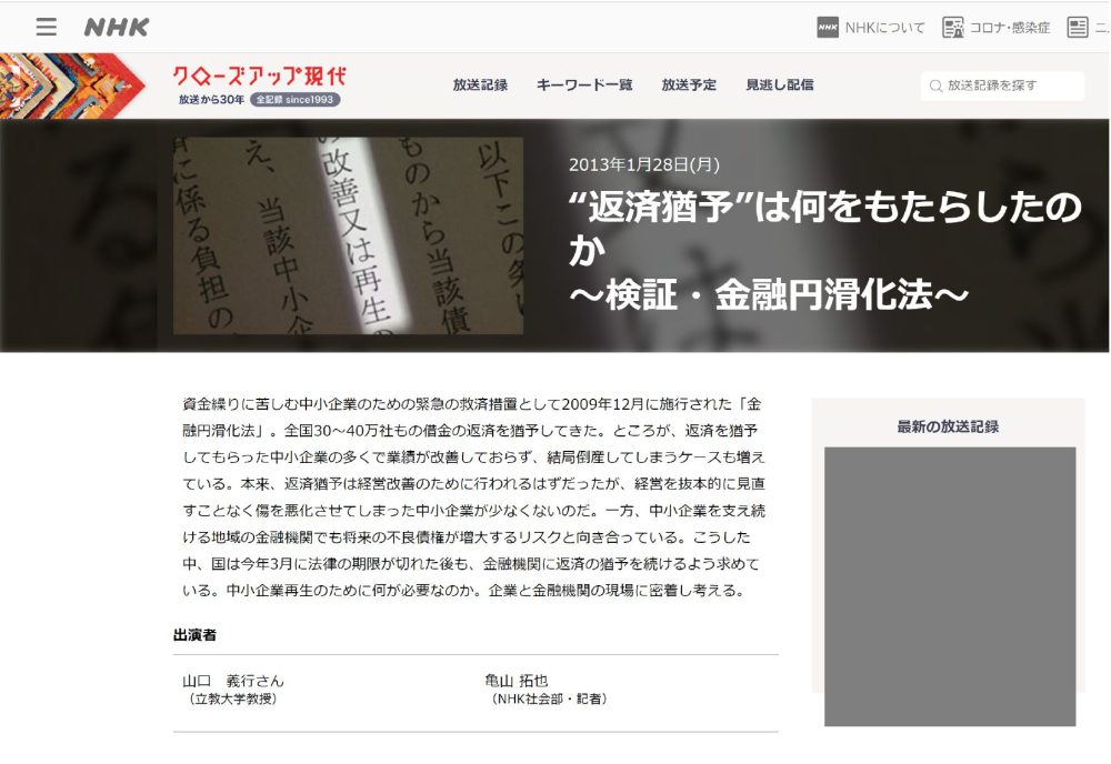 “返済猶予”は何をもたらしたのか ~検証・金融円滑化法~2012年11月から約2か月にわたり、NHKクローズアップ現代のディレクターから代表椢原が取材を受け、弊社クライアントの皆様にもご協力をいただきました。椢原が取材でお話をしたことを基に企業などに事実調査を行い、大学教授の方にも意見を出していただきながら番組が構成されました。