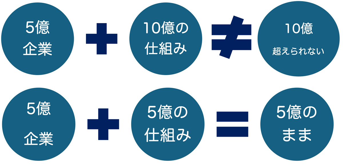 【5億の会社】に、【10億の仕組み】は、非効率で組織内で軋轢や問題が生じやすくなり、「仕組み」で超えるつもりが、その「仕組み」によって、逆に10億を超えられなくなるのです。