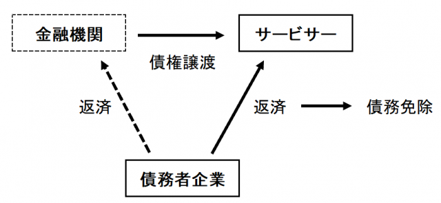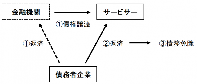 ①金融機関からサービサーが債権を買い取る。・・・・買取額